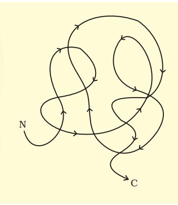 In proteins, only right-handed helices are observed as part of the secondary structure. In addition, the long protein chain folds upon itself like a hollow woolen ball, giving rise to the tertiary structure. This folding provides a three-dimensional view of the protein. The tertiary structure is absolutely necessary for the many biological activities of proteins. (Fig. 9.2 a, b)