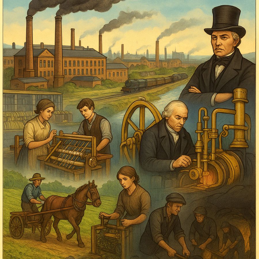 Good transport facilities like roads, canals, and later railways connected markets and industries. Political stability and government policies also favoured trade and protected private property. Scientific progress and inventions, such as Watt’s steam engine and Hargreaves’ Spinning Jenny, gave a further boost. Together, these factors made England the birthplace of the Industrial Revolution.