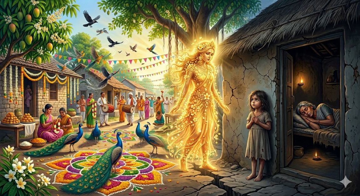 ಆದರೆ ಈ ಸಂಭ್ರಮದ ಮಧ್ಯೆ ಒಂದು ಪುಟ್ಟ ಬಾಲಕಿ ಬಡತನದ ಗುಡಿಸಲಿನಲ್ಲಿ ದುಃಖಭರಿತ ಜೀವನ ನಡೆಸುತ್ತಿದ್ದಾಳೆ. ಅವಳ ತಾಯಿ ಗುಡಿಸಲಿನಲ್ಲಿ ಮಲಗಿದ್ದಾಳೆ; ಮನೆಯ ಗೋಡೆಗಳು ಕತ್ತಲೆಯಲ್ಲಿವೆ. ಕಮ್ಮಾರ, ಕುಂಬಾರ, ನೇಕಾರ ಮತ್ತು ಇತರ ಶ್ರಮಿಕರ ಮನೆಗಳಲ್ಲಿ ಸಹ ಕೆಲಸ ನಿಂತಿದೆ. ಇವರ ಬದುಕಿಗೆ ವಸಂತ ಮುಖ ತೋರಲಿಲ್ಲ.